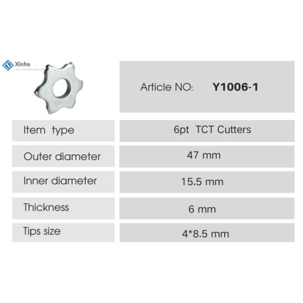 | Y1005 | 6pt TCT carbide cutters O.D 47* I.D 15.5* Thick 6mm Tungsten carbide size: 4*8.5mm Net weight: 0.048kg/pcs Packing: 500pcs/carton box | Bartell®-BEF 200 Airtec® - RT - 2000 /ES - 200 Smith® - SPS8 | SASE® - SC10E Edco® - CPM-8 MK® - SG5 / SG9 other 8 inch scarifiers |